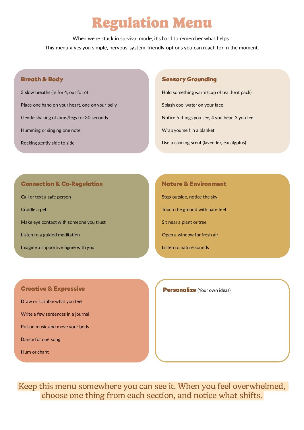 A simple, printable guide of nervous system practices you can “choose from” in the moment — like a menu. Whether you’re overwhelmed, shut down, or just needing a reset, the menu offers quick, practical options to help bring your body back into balance.